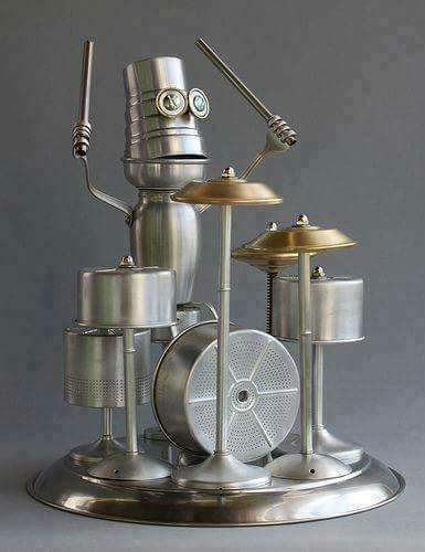 Jika sebelumnya menyulap besi-besi menjadi katak dalam pose umum, ada juga karya yang diubah menjadi katak yang tengah bermain drum. Bentuk katak lebih modern dengan kedua tangan yang seolah memegang stick drum.