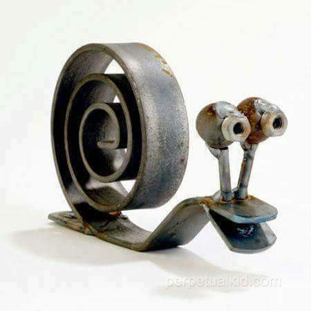 Bagi beberapa orang, besi tua memang terlihat tidak menarik karena telah berkarat. Tetapi di tangan orang kreatif, lagi-lagi akan disulap menjadi karya seni yang luar biasa. Dengan modal besi tua dan dua sekrup, seekor siput unik berhasil diciptakan.