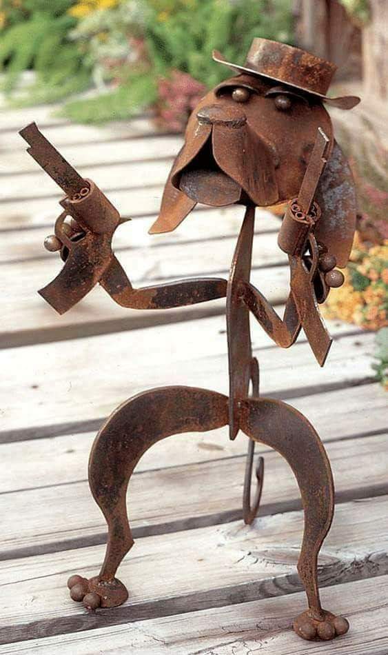 Besi-besi bekas juga bisa diubah menjadi seekor anjing koboi yang kekinian. Anjing dengan topi kopi yang juga dari besi, tengah berdiri memegang kedua pistol di tangannya. Benar-benar karya seni yang luar biasa dan kreatif.